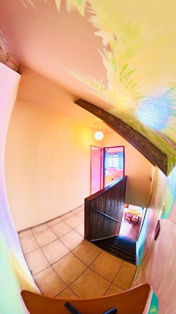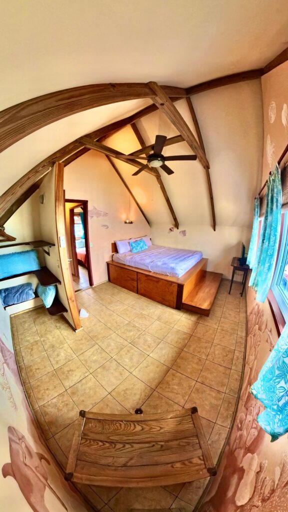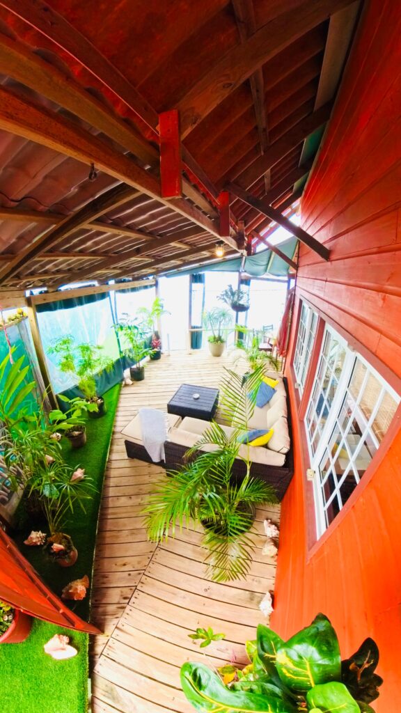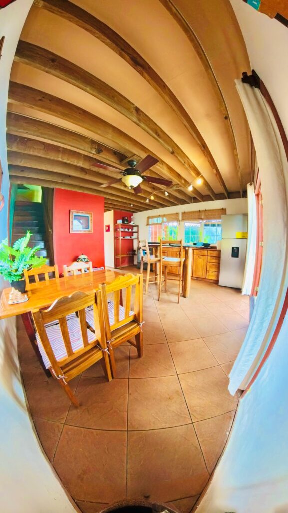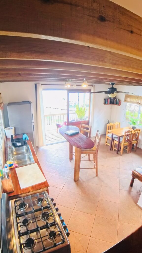 Downstairs you´ll find a fully equipped kitchen with a 5-burner stove, oven, and large fridge. The kitchen has an island table separating it from the breakfast nook table/ work area. Large double doors lead out onto the downstairs terrace with a dining table and chairs for those sundowners and breezy dinners outdoors, as well as a covered lounge with your all important hammock, sun loungers, and relaxation couch.