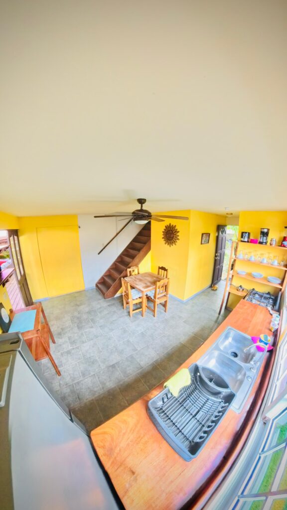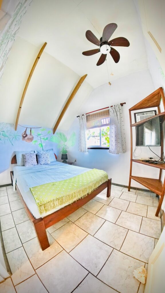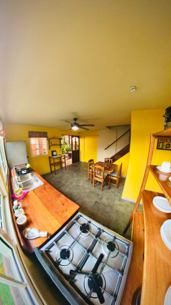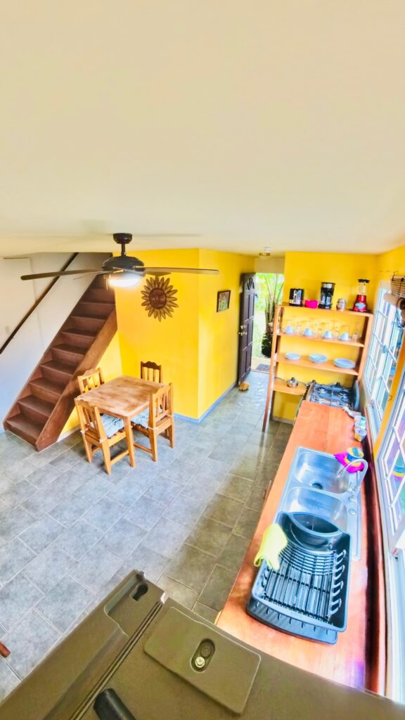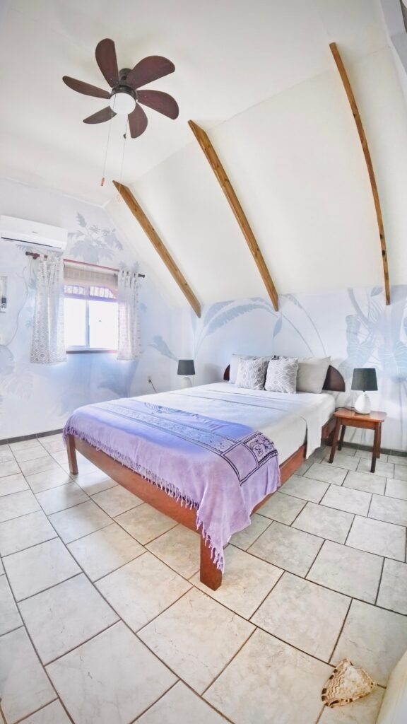 The Purple House 2 is alongside Purple House 1 and are a mirror of each other. Together they can be opened up into one large home. Each is rented separately or you can rent them both together. Purple House Two has two bedrooms upstairs with the master bedroom having a walk in wardrobe. Both bedrooms have air-conditioning and fans. Downstairs you will find the kitchen with dining table for indoor eating.