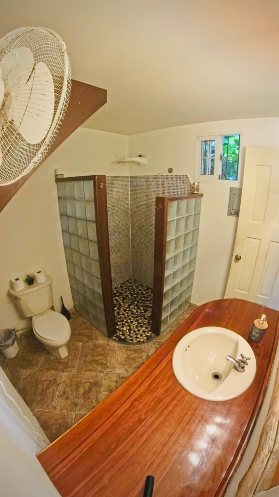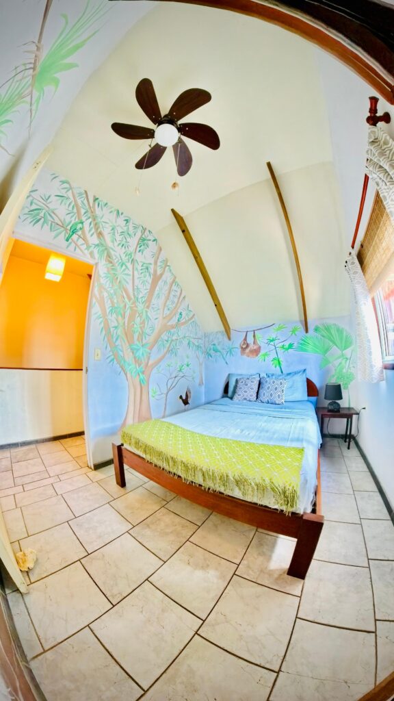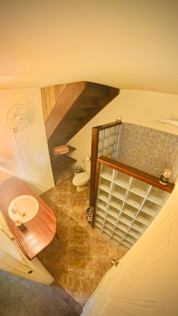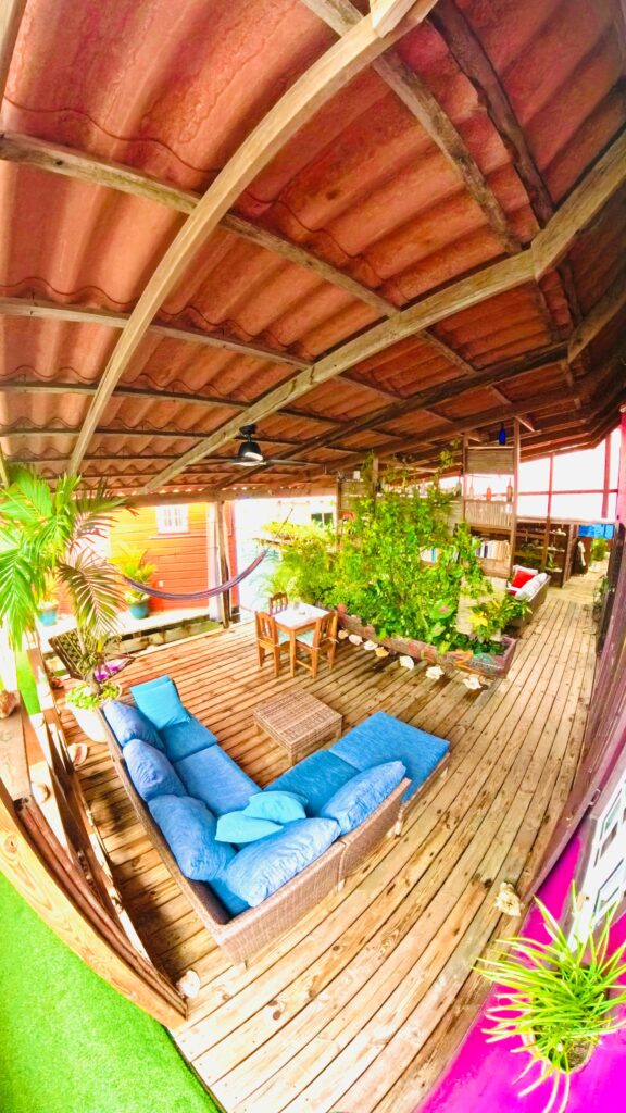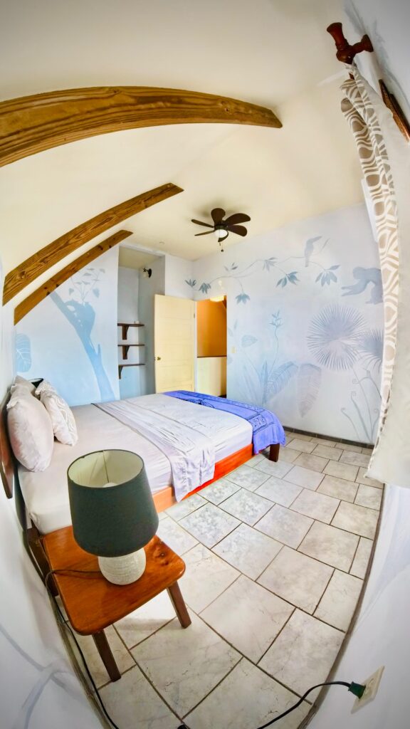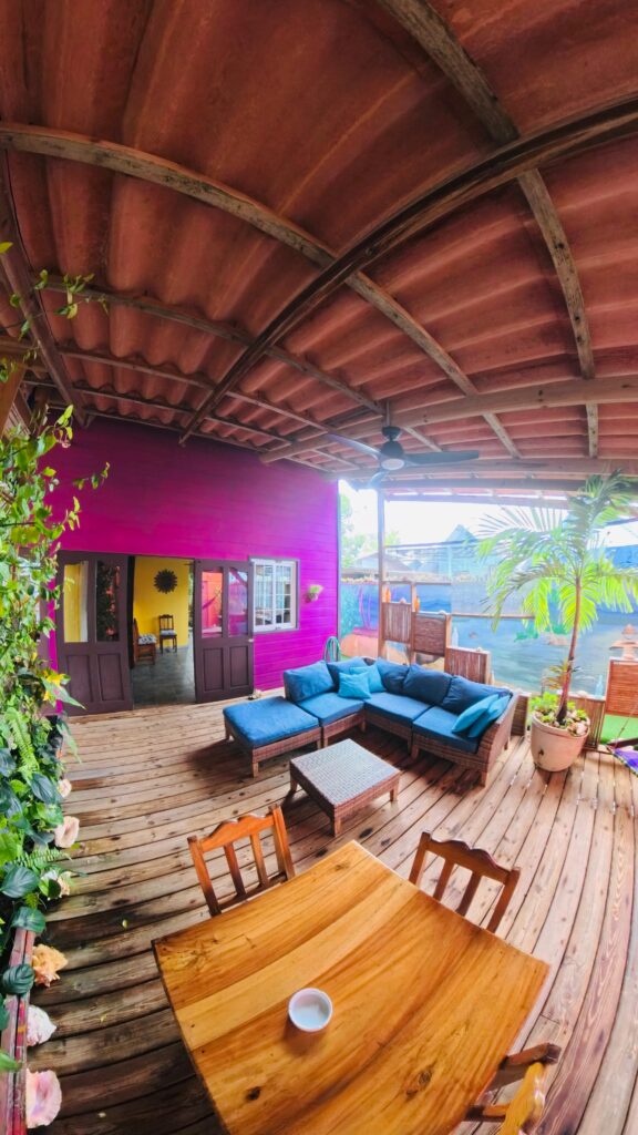 The Purple House 2 is alongside Purple House 1 and are a mirror of each other. Together they can be opened up into one large home. Each is rented separately or you can rent them both together. Purple House Two has two bedrooms upstairs with the master bedroom having a walk in wardrobe. Both bedrooms have air-conditioning and fans. Downstairs you will find the kitchen with dining table for indoor eating.