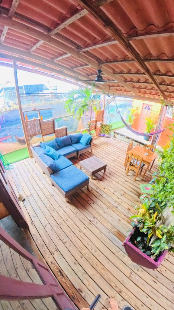 The kitchen is equipped with a large fridge/freezer and a 4 burner stove and oven. Large double doors lead out onto the outside terrace which has a dining table and chairs, a large lounger as well as the all important hammocks. The large outdoor deck is covered by a high roof for protection from the sun whilst allowing for the cool breezes to pass through.